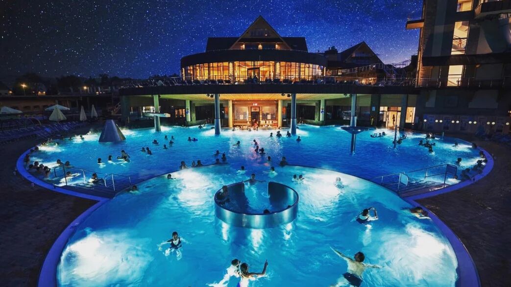 aż 30 niecek basenowych w tym basen sportowy, baseny wewnętrzne i zewnętrzne, moc atrakcji: gejzery, rwąca rzeka, sztuczna fala, stanowiska do hydromasażu, zjeżdżalnie z zapadnią oraz zjeżdżalnie pontonowe i piaszczysta plaża na zewnątrz.